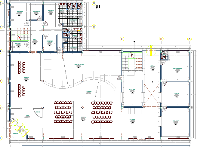Financial center office architecture layout plan details that includes a detailed view of main entry door, kitchen, cafeteria, reception area, waiting area, sitting area, conference room, meeting room, employee offices, head offices, toilets and much more of office building details.