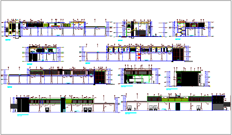 Structural view of company with different axis section and sectional elevation view dwg file in section view with different axis with view of area distribution,column and wall view and different sectional elevation view with necessary dimension.
