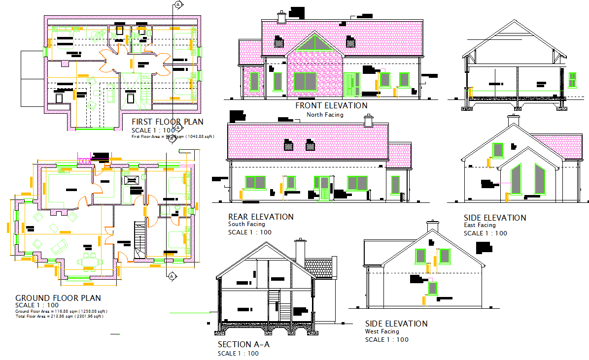 Two Floor House Plan with Elevations and 213sqm Total Layout