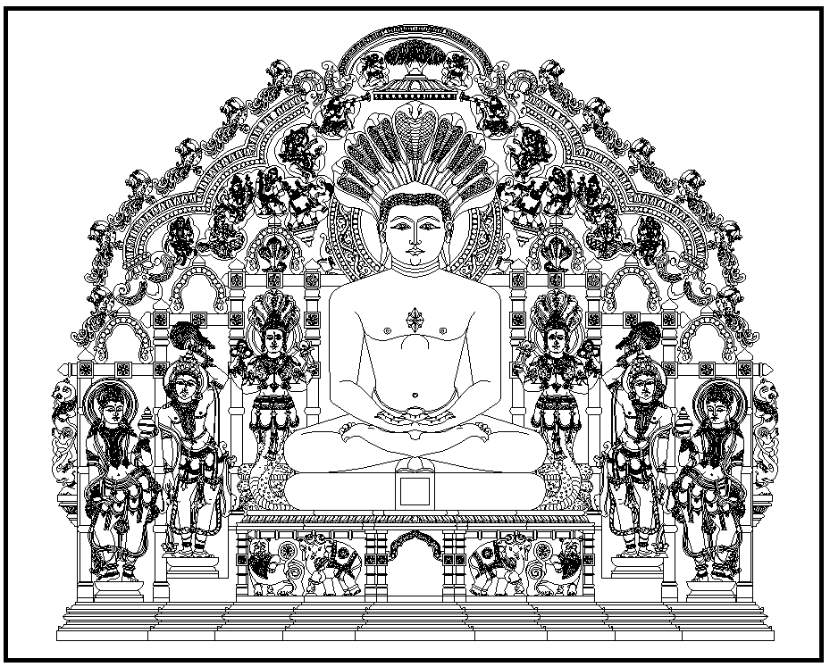 The upper arch features intricate scrollwork, floral patterns, miniature figurines, and decorative motifs that highlight classical Indian sculptural style. The stepped base includes ornamental panels, geometric detailing, and elements inspired by ancient temple pedestals. Every section of the artwork, from pillars and arches to the layered crown and side figures, has been executed with high accuracy, making this file ideal for architectural references, CNC engraving, mural design, 3D temple visualization, laser cutting, and heritage-inspired interior décor. This illustration is highly useful for architects, designers, artists, and cultural project planners seeking authentic religious and artistic elements to enhance spiritual spaces or traditional design concepts.