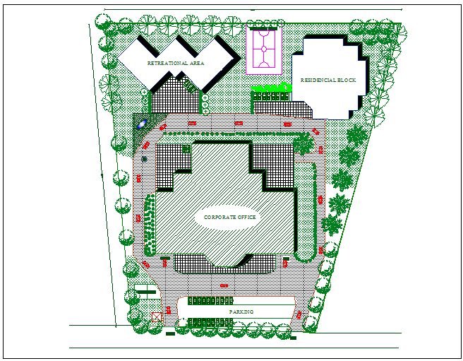 Plan view of corporate building detail dwg file, Plan view of corporate building detail with specification detail, landscaping detail etc