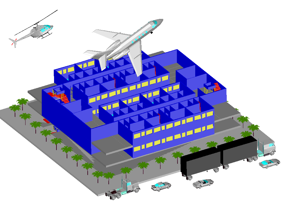 This Modern Hotel Building Project Design in 3D AutoCAD DWG format provides a complete architectural visualization of a multi-storey hotel layout, including room divisions, corridor alignments, staircase positioning, and external landscaping. The structure displays two primary levels with a repeated room module measuring approximately 4m by 5m, arranged around central circulation paths. Staircases are positioned at opposite ends of the building to support efficient vertical movement, while exterior windows run across both floors, offering a clear façade rhythm and natural lighting. The image also shows a surrounding driveway, parking zone, and roadside vegetation aligned in uniform intervals of nearly 6m, enhancing the overall site planning accuracy. Additional CAD elements, such as service trucks, cars, and palm trees, help visualize scale, approach movement, and building placement.