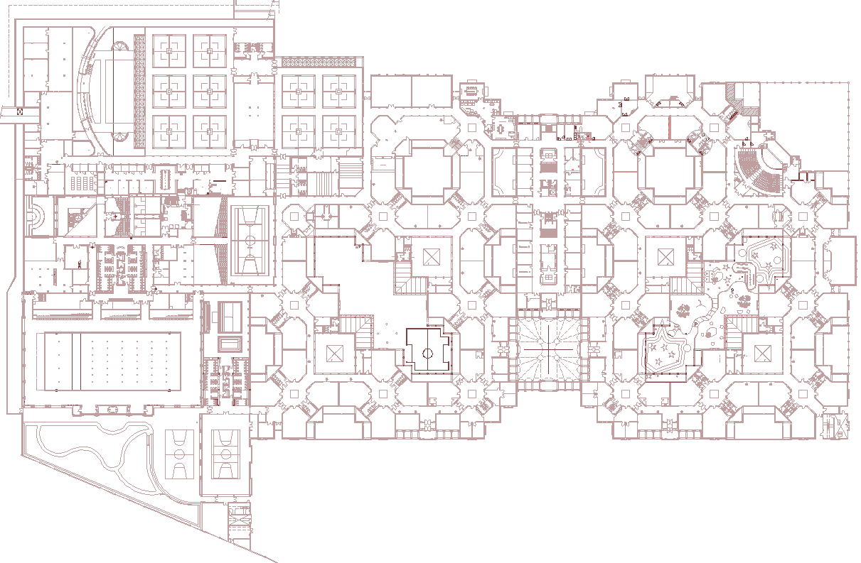 This Junior School AutoCAD DWG file provides a fully detailed architectural layout that showcases classrooms, corridors, activity rooms, sports zones, staircases, and internal functional areas across the entire campus footprint. The layout includes multiple classroom clusters arranged around square and octagonal nodes, each grid measuring roughly 6m to 7m in span. The central circulation spine connects teaching blocks, multipurpose rooms, indoor play courts, and administrative spaces. The design also includes auditorium zones, cafeteria seating areas, staff rooms, washrooms, and designated teacher support rooms, all arranged in an efficient and symmetrical plan. The sports courts located on the lower left portion appear approximately 14m by 24m, with clear boundary lines and access points. Storage rooms, service ducts, and mechanical areas are distributed strategically throughout the building footprint.