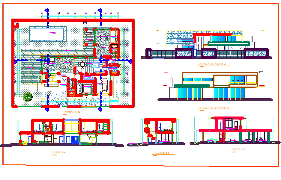 Single Family House AutoCAD Layout with Sections and Elevations Plan