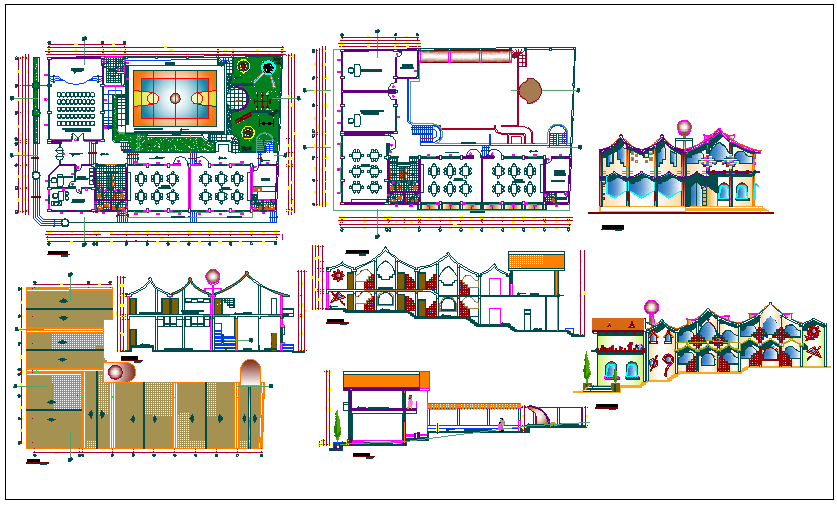 Interior view with plan elevation and section view of government school dwg file in plan with view of class room view and director office,garden,play ground with playing