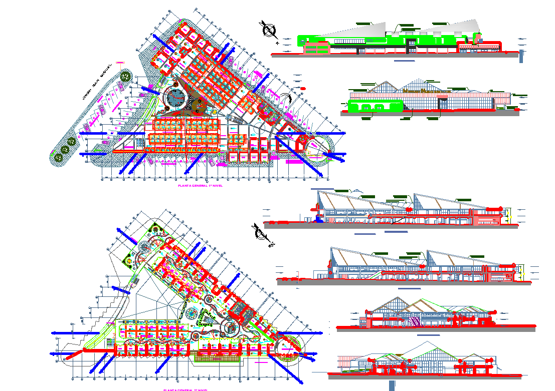 The architecture layout plan, with furniture detail in shops and canteen, section plan, elevation design and much more detailing of New Modern Market plan.
