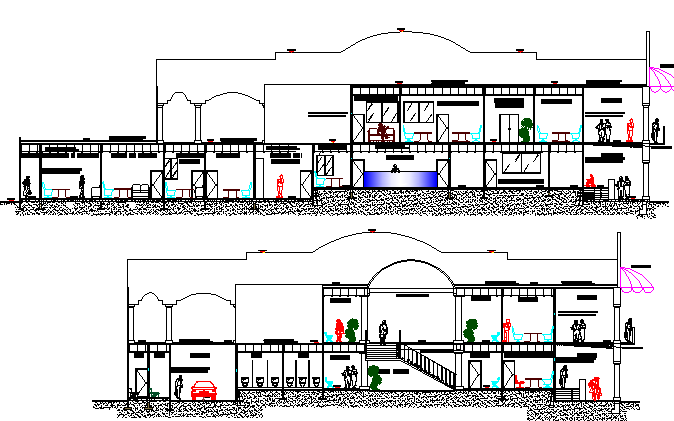 Back and side sectional view of municipal town hall project that includes a detailed view of back sectional view, side sectional view, indoor staircase view, doors and windows view, dome view, wall design, human blocks, main entry gate, reception, sitting area, admin offices, toilets and much more of town hall section details.