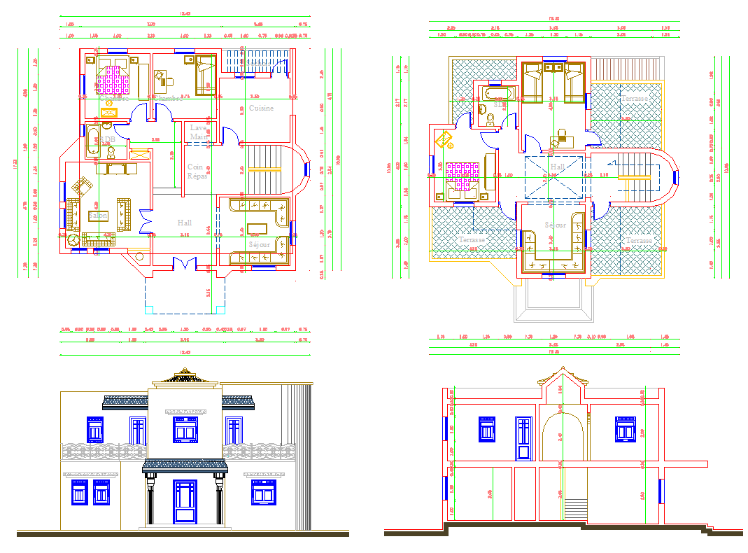 Bungalow Plan dwg file. The architecture layout plan of ground floor plan and first floor plan with furniture detailing, section plan and elevation design of Bungalow Plan.