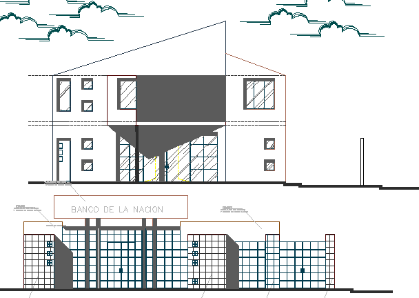 Front and back elevation details of national bank that includes a detailed view of front elevation, back elevation, floor view, doors and windows view, name hoarding view, wall design, main entry gate and much more of bank elevation details.