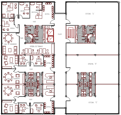 Administrative office building architecture layout plan details main entry gate, security desk, reception area, accountant desk, inquiry desk, sitting area, general hall, manager cabin, employee cabin, male toilet, female toilets, kitchen, dining area, meeting room, conference hall, employee offices and much more of office building layout.