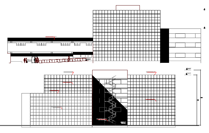 Front and back elevation view of multi-flooring municipal office building dwg file