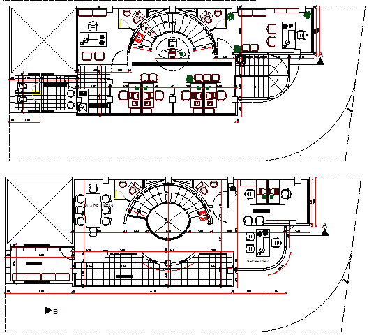Ground and first floor plan details of office and shop building that includes a detailed view of ground floor, first floor, main entry door, reception area, waiting area, sitting area, passage, general hall, employee cabin, head offices, clerk room, conference room, meeting room, toilets, kitchen, dining area and much more of office floor plan details.