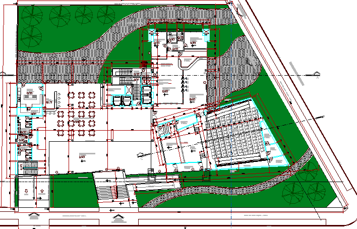Landscaping with structure details of multi-flooring college building details dwg file.