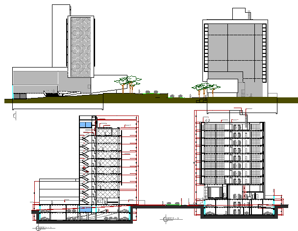 All sided elevation and sectional details of multi-flooring college building that includes front elevation and section, back elevation and section, side elevation and sections, doors and windows view, flooring view, staircase view, tree view, basement car parking view, canteen area, toilets and much more of college elevation and section details.