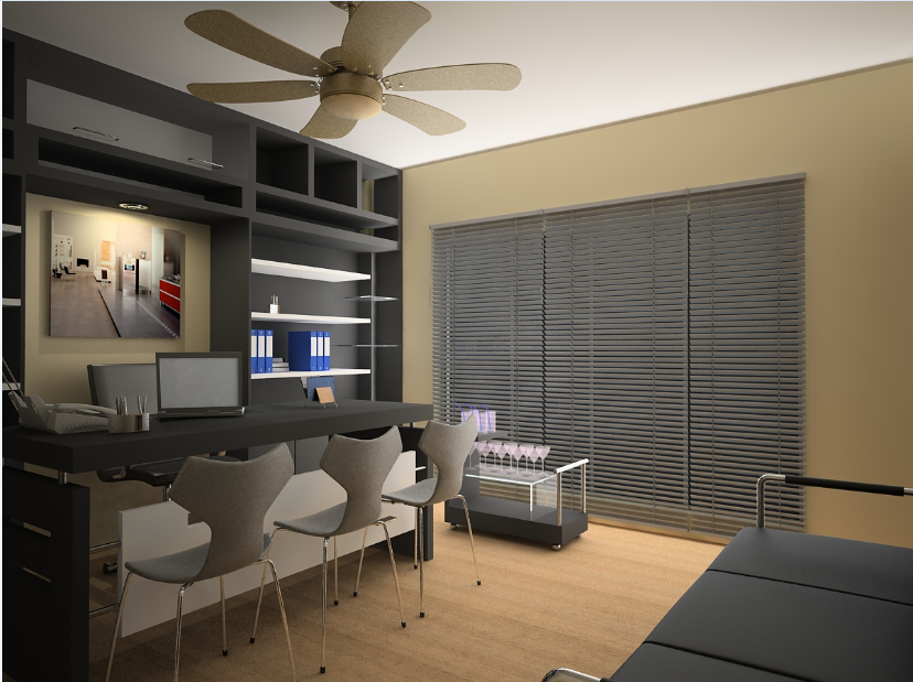3d design of office interior details that includes a detailed view of office desk table, chairs, computer, fan, sitting area, wall design, indoor decorative elements and much more of office design.