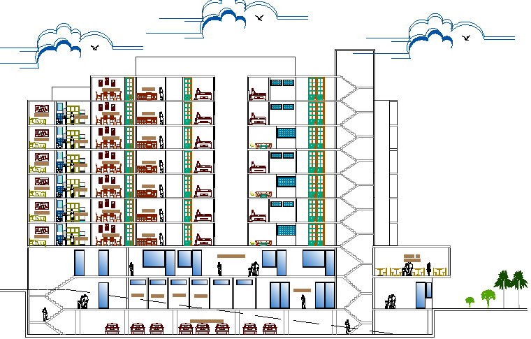 Education apartment building with commercial sectional details that includes a detailed view of main section, flooring view, doors and windows view, tree view, basement car parking view, staircase view, consultant room, hall kitchen, bedroom, dining area and much more of housing apartment details.