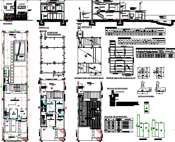 One family housing architecture project that includes a detailed view of elevation details, section details, structure details, constructive details, doors and windows view, main entry door, family hall, living room, kitchen, dining area, bedroom, staircase view, foundation plan details and much more of house project.