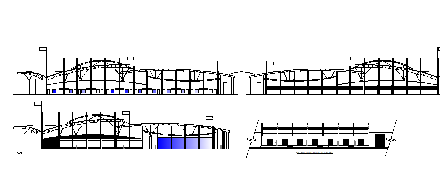 Front, back elevation and sectional view details of shopping mall details dwg file.