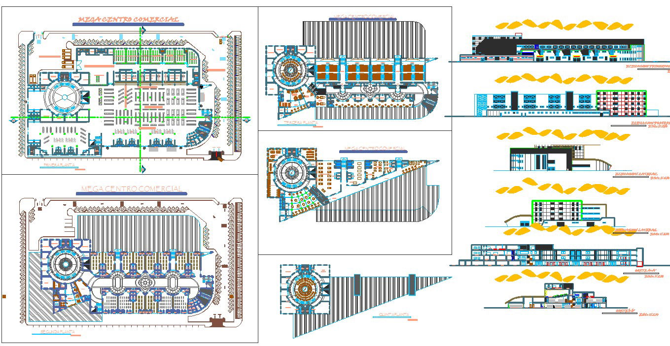 The architecture layout plan of ground floor plan, first floor plan, second floor plan and third floor plan with furniture detailing, section plan and elevation design of Shopping Center plan.