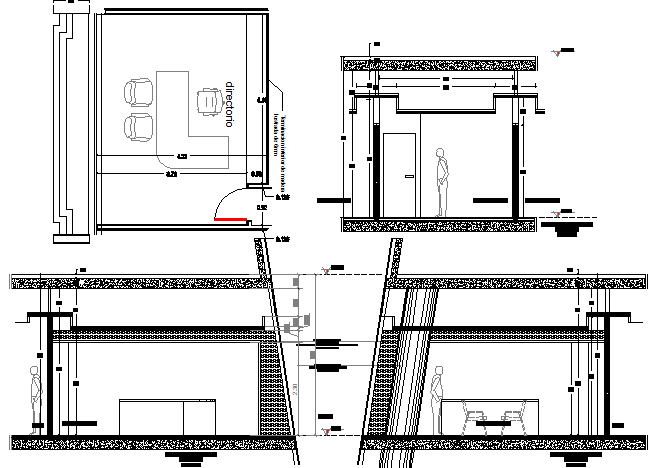 Cut sectional view of corporate office that includes a detailed view of side cut sectional view details, office desk, wall details with measurements, human blocks, cuts, joints and much more office project details.
