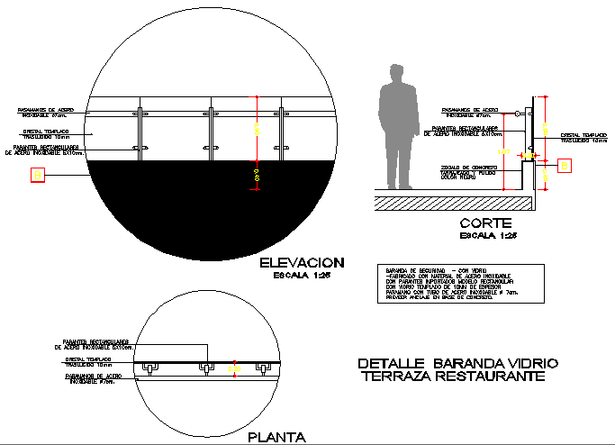 Glass railing of terrace restaurant details that includes a detailed view of safety railing with glass, fractured with stainless steel material, ladies rectangular model, tempered glass of thickness, handrail with stainless steel tube, prevent anchorage base on concrete and much more of railing details.