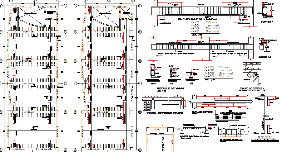 Foundation plan details with column and beam of office building that includes a detailed view of column construction, beam construction, beam construction, floor construction, concrete plan, measures, joint, cuts and much more of constructive details of office building.