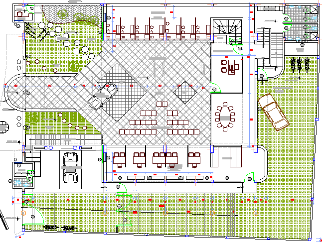 Landscaping with structure details of municipal government office building that includes a detailed view of indoor roads, main entry gate, plant view, tree view, landscaping, car parking view, decorative garden elements and much more of landscaping details.