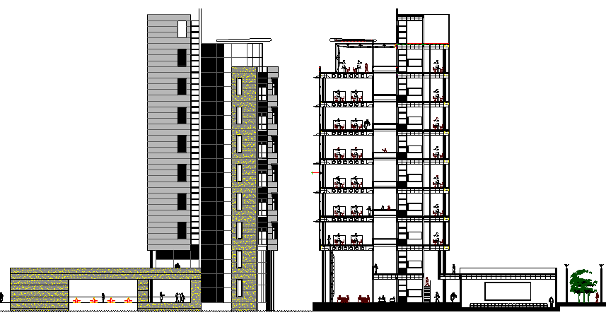 Side elevation and sectional view of administration building that includes a detailed view of left and right side elevation, sectional view, car parking view, flooring view, car parking view, tree view, staircase view, doors and windows view, balcony view and much more of building elevation and sectional details.