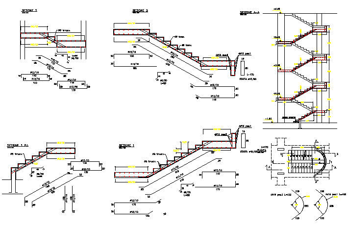 Staircase details of multi-story building that includes a detailed view of floor vise staircase, steps details, supportive railing details, wooden railing view, measurements, construction details cuts and much more of staircase details.