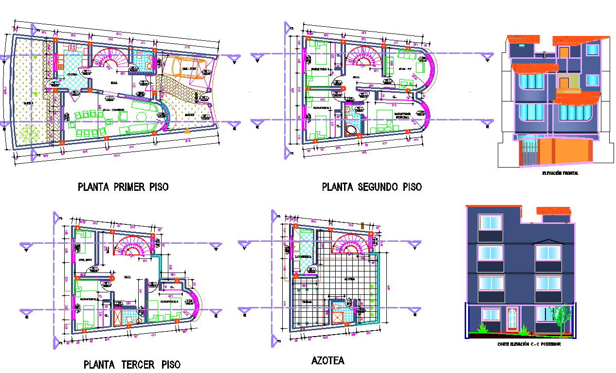 House plan dwg file. Layout plan of ground floor plan first floor plan, second floor plan, terrace floor plan, furniture plan and elevation design of House plan