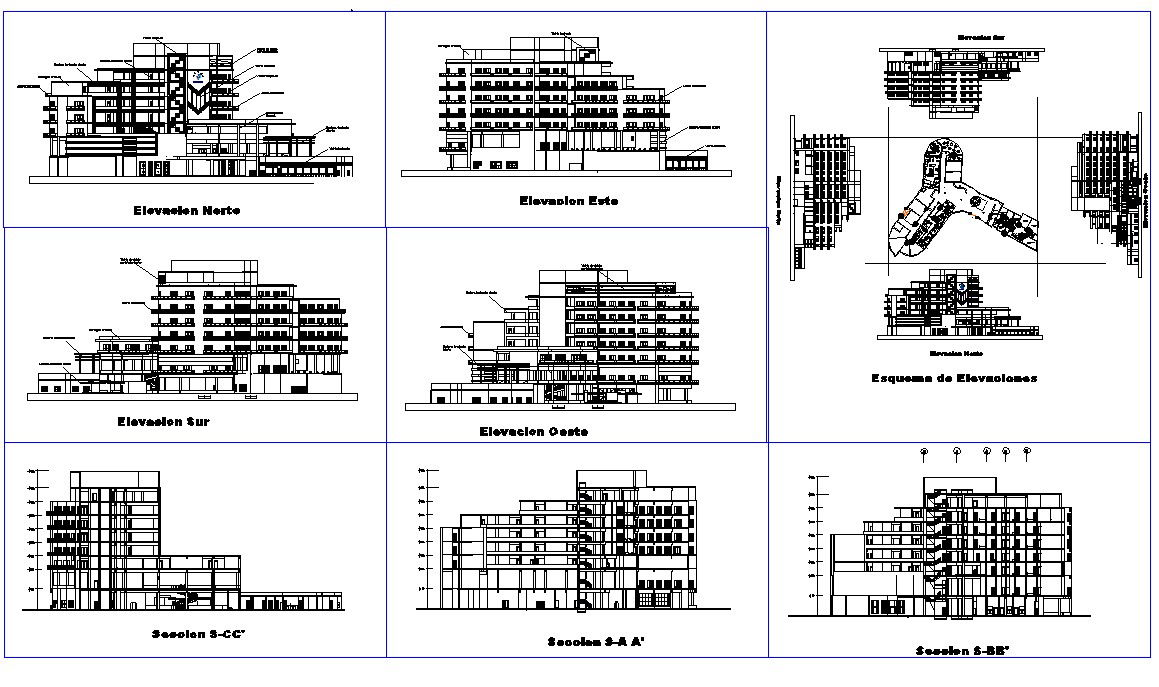 Modern Hotel dwg file. Section plan in all side, elevation design in all side and layout plan of Modern Hotel project.