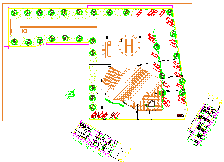 Office and seminary center dwg file, landscaping details of a office is shown, seminar details