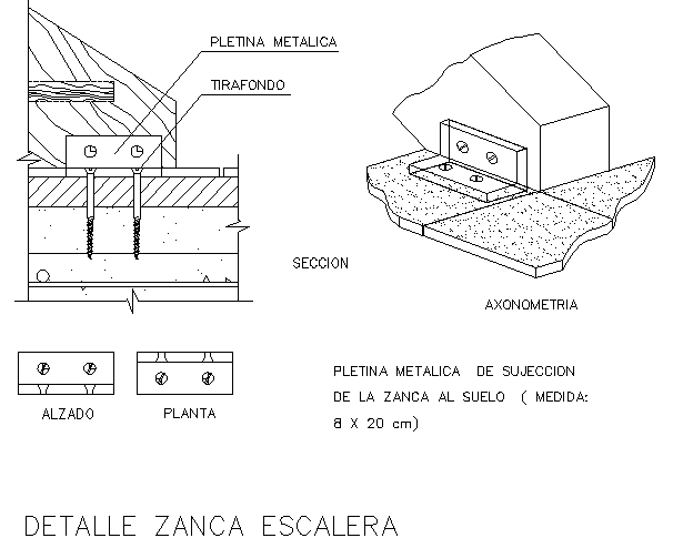Metal staircase stringer details that includes a detailed view of metal type, tirafondo, section, trigonometry, metallic fixing plate, from the zone to the ground, detail zone ladder, raised, plan and much more of staircase details.