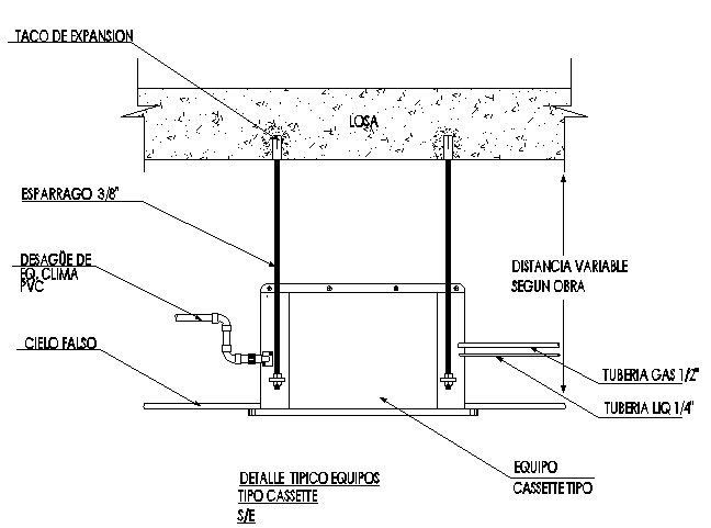 Air conditioning equipment details that includes a detailed view of type cassette equipment, typical detail equipment, gas pipe, false sky, variable distance according to work, sparrow, drain of climate and much more of air conditioning equipment.