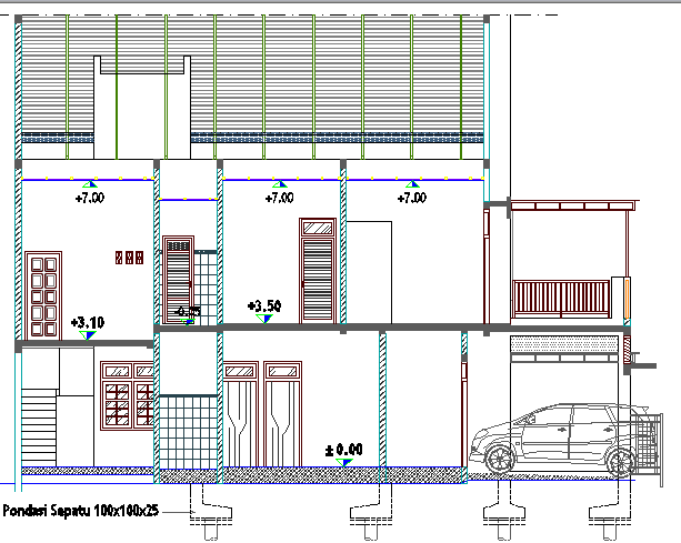 Front sectional view of shopping center details that includes a detailed view of front section, doors and windows view, wall design, roof view, car parking view, indoor staircase view, footing view, column view and much more of sectional details.