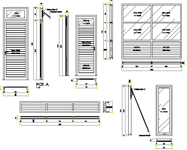 Doors and windows installation details of shopping center details that includes a detailed sectional view of doors, sectional view of windows, door frame, windows frame, wooden details, measurements details, cuts joints and much more of doors and window installation details.
