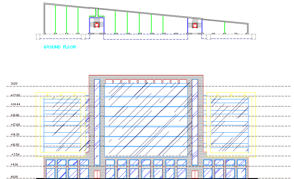 Elevation of a building and sectional details dwg file, this file contains details of a building and its sectional detail
