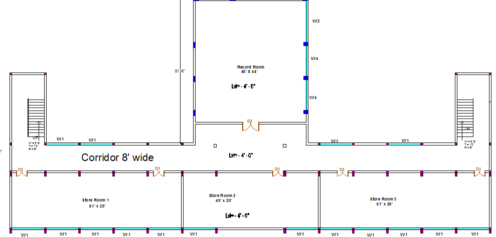 Basement floor layout plan of primary school that includes a detailed view of corridor wide, store room, store room 2, record room, indoor staircase, doors, wall design, passage and much more of floor layout plan details.