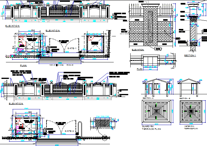 Boundary wall of gate architecture project details that includes a detailed view of guard room, plan, inside road, terrace plan, toilets, front elevation of wall, back elevation of wall, main gate, sectional details, meter room terrace plan section details and much more of gate plan details.
