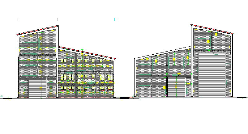 Left and right side elevation view of production center that includes a detailed view of doors and windows view, roof view, main entry gate, roof view and much more of production house elevation details.