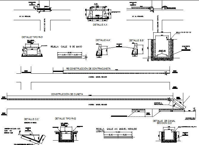 Construction of curbs and channeling storm water that includes a detailed view of canal section details, connection canal existence, avenue module reconstruction and much more of construction details.