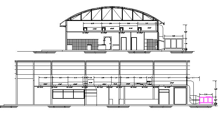 Front and side elevation view of primary school project that includes a detailed view of front elevation, side elevation, doors and windows view, dome view, staircase view, floor view, wall design, terrace view and much more of school elevation project.