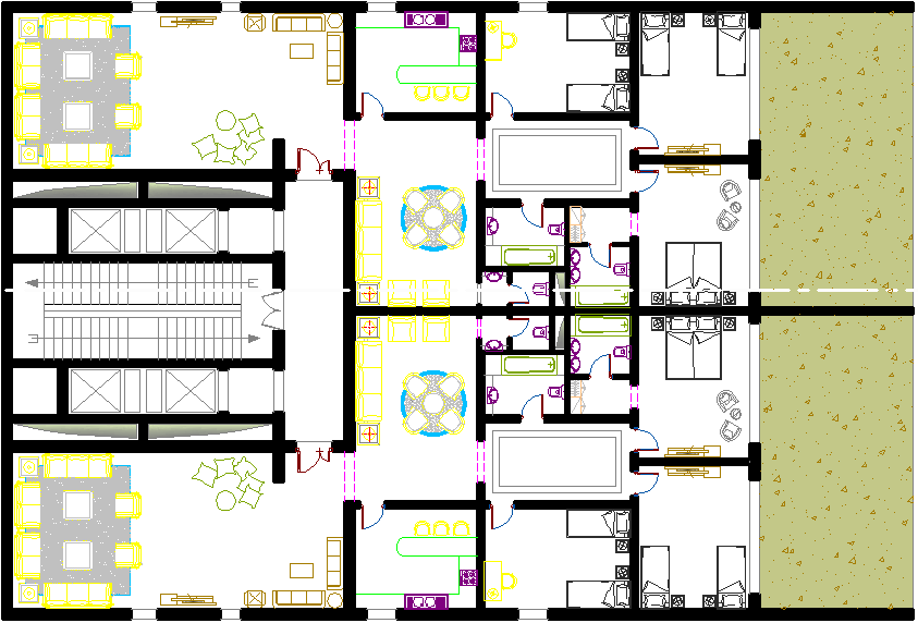layout plan of a hotel dwg file, here there is layout plan of hotel, containing all details, furniture , landscape, space, luxurious hotel design in auto cad format