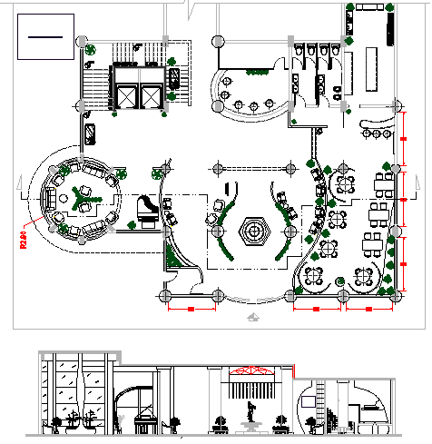 Front section and structural layout plan details of hotel that includes a detailed view of front elevation, spiral staircase view, doors and windows view, main entry gate, reception area, garden, garden cafeteria, waiting lounge, sitting area, laundry area, rest room, passage, cleaning department, restaurant, dining area, kitchen, toilets and much more of hotel details.