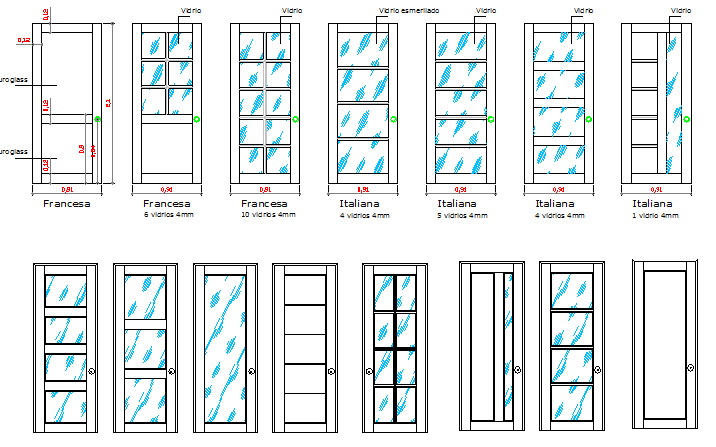 Multiple door design of building that includes a detailed view of door types, door sizes, door colors for multi purpose uses like kitchen door, hall door, bathroom door office door, wide door, single door, double door and much more of door blocks details.