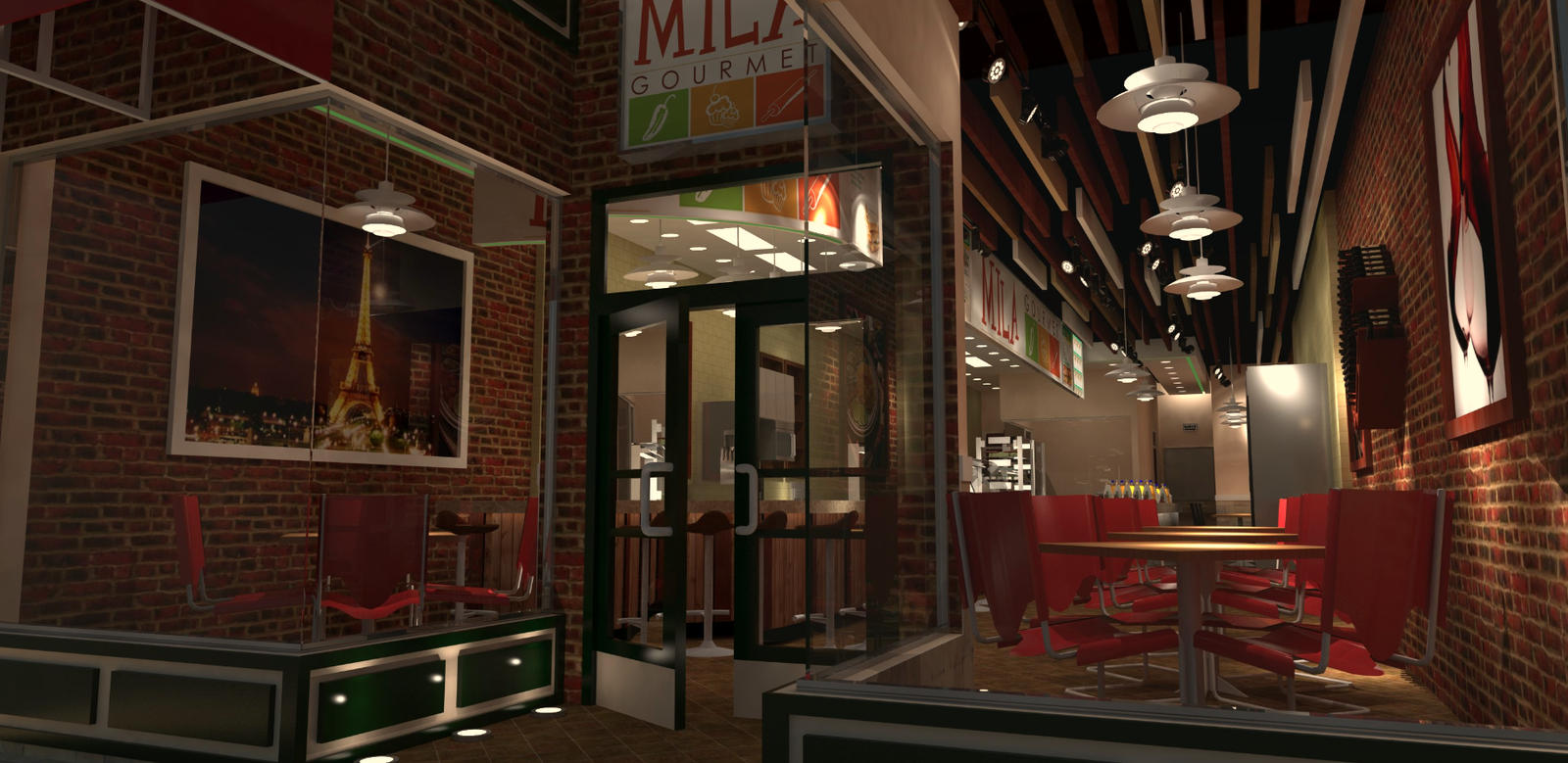 This 3D restaurant DWG drawing showcases a detailed interior layout featuring brick wall finishes, suspended ceiling lighting, decorative wooden beams, and a complete seating arrangement designed with accurate measurement proportions. The model includes a realistic entrance façade with glass doors, display frames, signage placement, and exterior bench seating visible from the storefront. Inside the restaurant, the drawing highlights counter design, chair alignment, dining tables, flooring textures, and wall-mounted artwork, reflecting the operational flow of a contemporary dining space. The lighting elements, including ceiling-mounted fixtures and track lights, are positioned to represent a balanced illumination plan suitable for AutoCAD visualization and interior design reference.