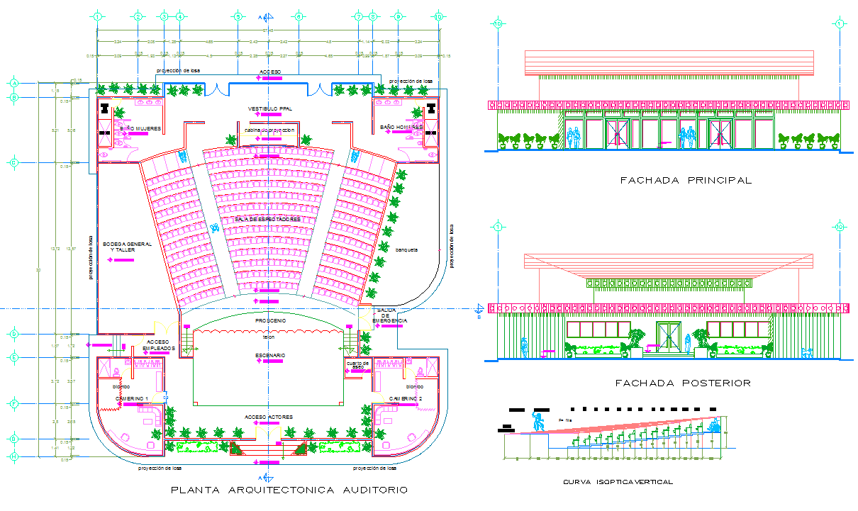 The auditorium hall DWG file also includes detailed elevation drawings showing the principal façade, rear façade, landscaped frontage, column spacing, door sections, and overhang structures. A vertical isoptical curve section highlights the visibility gradient from each seating row to the stage, making it useful for acoustic and audience-view analysis. The façade drawings show shading elements, access doors, window lines, and decorative features that contribute to the overall architectural identity of the auditorium. This DWG is ideal for architects, civil engineers, and interior designers who require detailed auditorium planning references for stage design, seating optimization, and technical drawing development. Cadbull subscribers can download this file to enhance project documentation and streamline drafting workflows.