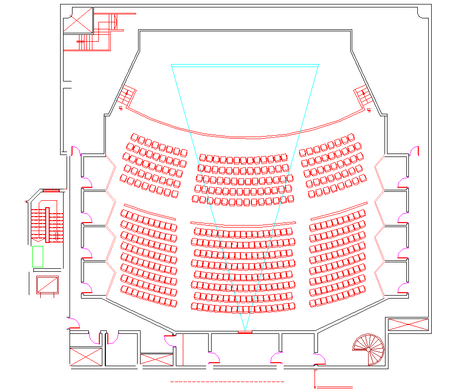 This theater DWG file provides a complete architectural layout of a theater plan featuring a full seating arrangement, audience circulation paths, and stair access points designed around the curved geometry of the hall. The uploaded drawing includes multiple rows of seats arranged in a radial pattern to ensure clear visibility toward the stage. The central viewing axis is represented with angled projection lines, showing optimized sightlines for spectators. Side aisles, exit doors, and entry corridors are clearly marked, allowing users to understand the functional movement patterns within the theater. Staircases, technical rooms, and service areas are drawn with accurate line weights and wall thicknesses suitable for architectural working drawings.