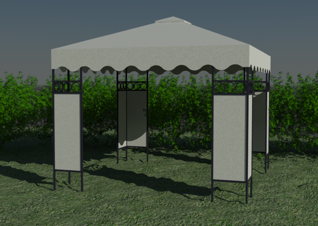 Steel and polyester arbor roof style design that includes a detailed elevation view with roof view, green area, supportive pillars, landscaping view and much more of arbor design project.