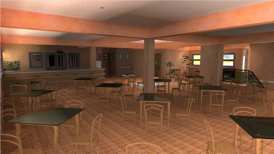 3D image view of a restaurant dwg file, this file shows dining seating arrangement , proper spacing is shown